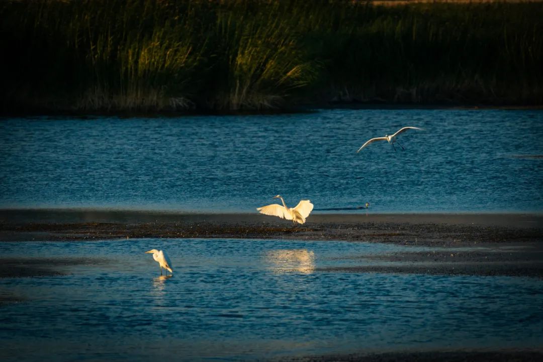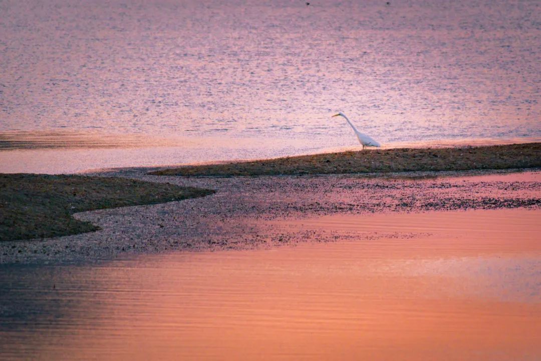 日暮落下之时,湖面是一片的橙黄色,嬉闹了一天的鸟群也安静了下来。它们伫立在湖边,享受轻柔的风拂过每一片羽毛,任由落日的辉光印染在羽毛上。此刻世界都是安详的静谧的,只有风轻轻的述说着喜悦。